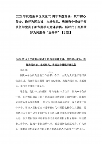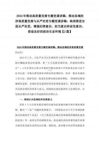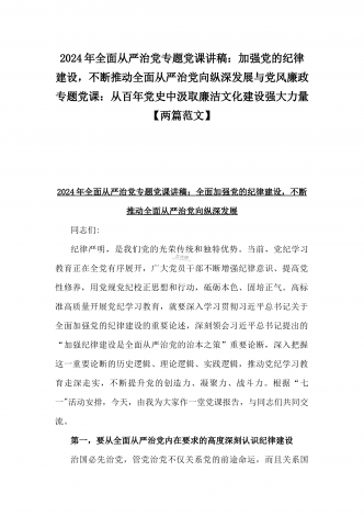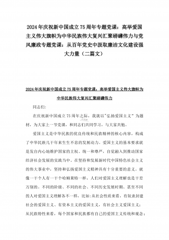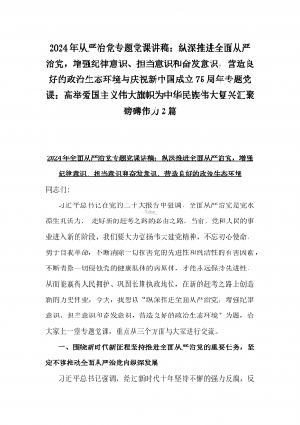 2024年从严治党专题党课讲稿:纵深推进全面从严治党,增强纪律意识、担当意识和奋发意识,营造良好的政治生态环境与庆祝新中国成立75周年专题党课:高举爱国主义伟大旗帜为中华民族伟大复兴汇聚磅礴伟力2篇