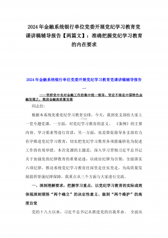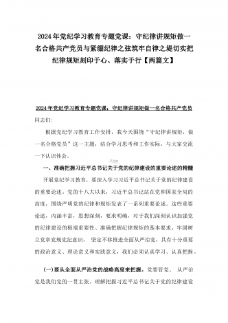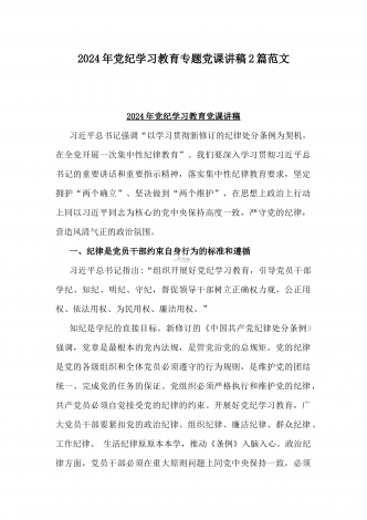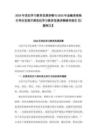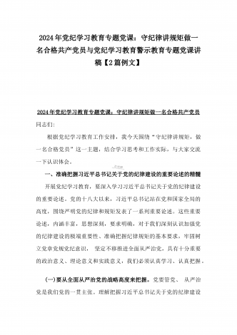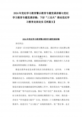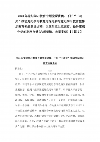 2024年党纪学习教育专题党课讲稿:下好“三功夫”推动党纪学习教育走深走实与党纪学习教育暨警示教育专题党课讲稿:以案明纪以纪正行,提升遵规守纪的高度自觉(六项纪律、典型案例)【2篇文】