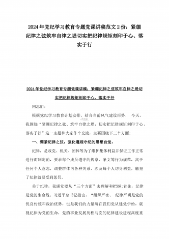 2024年党纪学习党课讲稿:紧绷纪律之弦筑牢自律之堤切实把纪律规矩刻印于心、落实于行与党纪学习教育暨警示教育专题党课讲稿:以案明纪以纪正行,提升遵规守纪的高度自觉(六项纪律典型案例)2篇文
