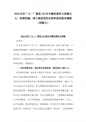 2024年庆“七一”专题党课讲稿:把“认真”二字刻入党员干部的灵魂与为实现新时代新征程党的使命任务提供坚强纪律保障(两篇范文)