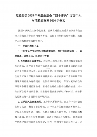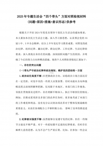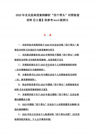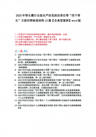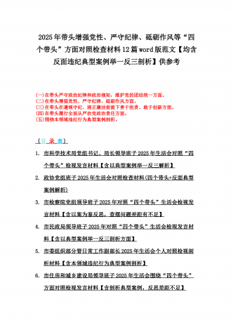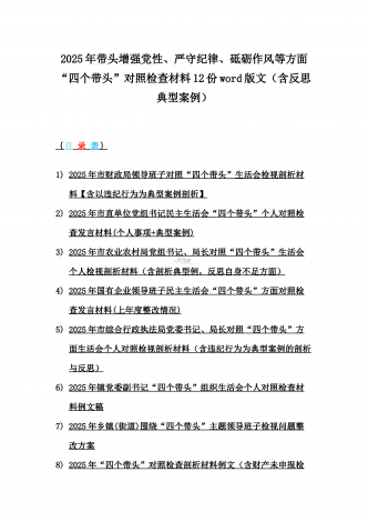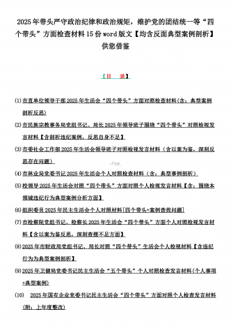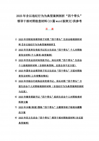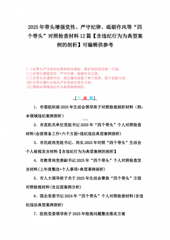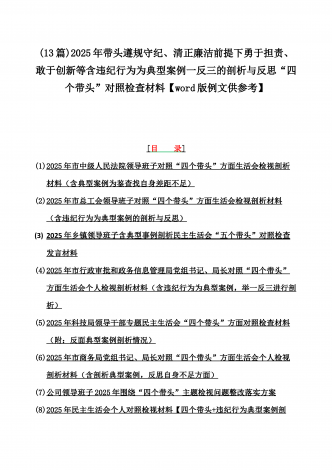 (13篇)2025年带头遵规守纪、清正廉洁前提下勇于担责、敢于创新等含违纪行为为典型案例一反三的剖析与反思“四个带头”对照检查材料【word版例文供参考】[目录](1)2025年市中级人民法院领导班子对照“四个带头”方面生活会检视剖析材料(含典型案例为鉴查找自身差距不足)(2)2025年市总工会领导班子对照“四个带头”方面生活会检视剖析材料(含违纪行为为典型案例的剖析与反思)(3)2025年乡镇领导班子含典型事例剖析民主生活会“五个带头”对照检查发言材料(4)2025年市行政审批和政务信息管理局...