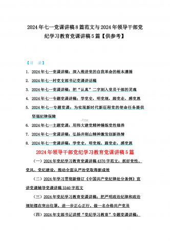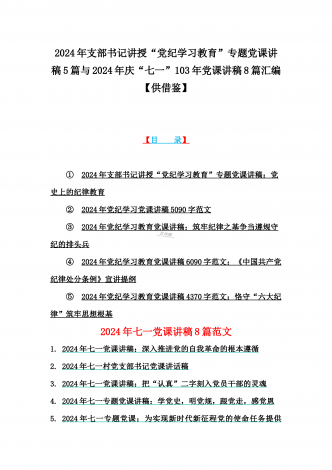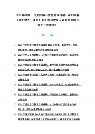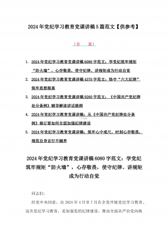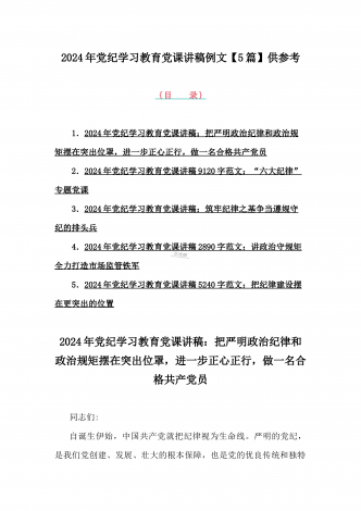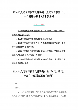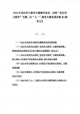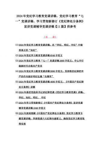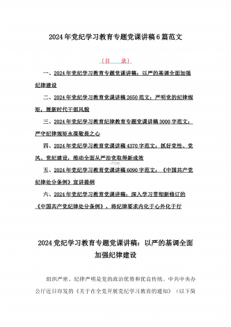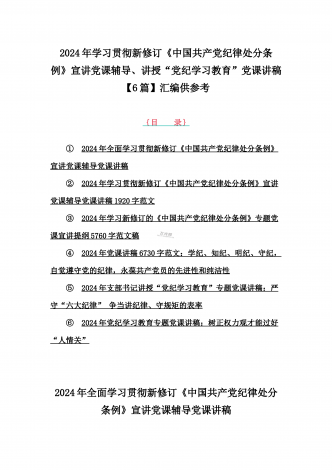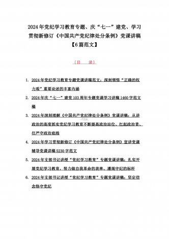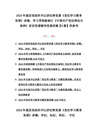 2024年基层党组织书记讲纪律党课《党纪学习教育党课》讲稿、学习贯彻新修订《中国共产党纪律处分条例》宣讲党课辅导党课讲稿【6篇】供参考{目录}1)2024年基层党组织书记讲纪律党课《党纪学习教育党课》讲稿:学纪、知纪、明纪、守纪2)2024年学习贯彻新修订《中国共产党纪律处分条例》宣讲党课辅导党课讲稿3340字范文3)2024年深刻理解《中国共产党纪律处分条例》党纪学习教育专题党课讲稿:学深悟透六大纪律内涵要义,确保党纪学习教育取得实效4)2024年支部书记讲授“党纪学习教育”专题党课讲稿:在党...