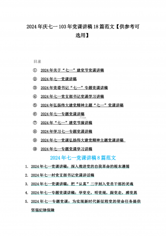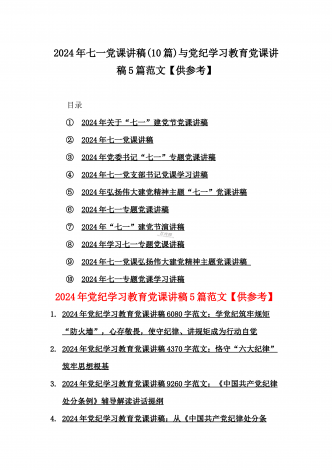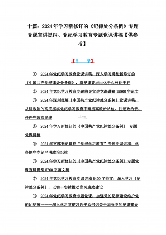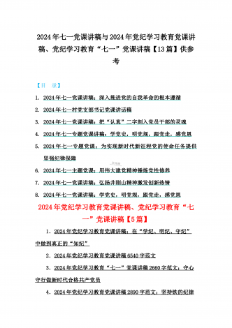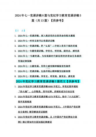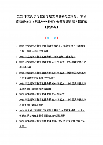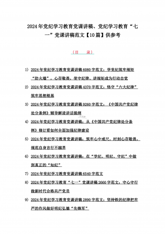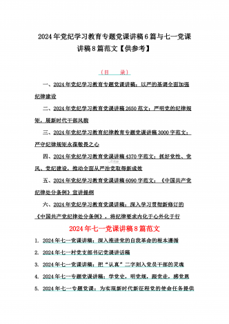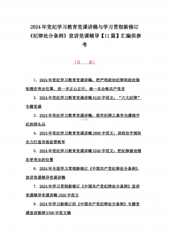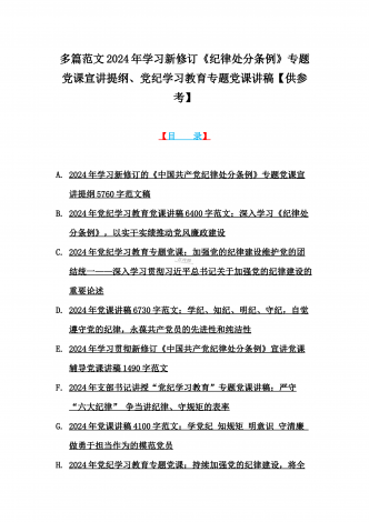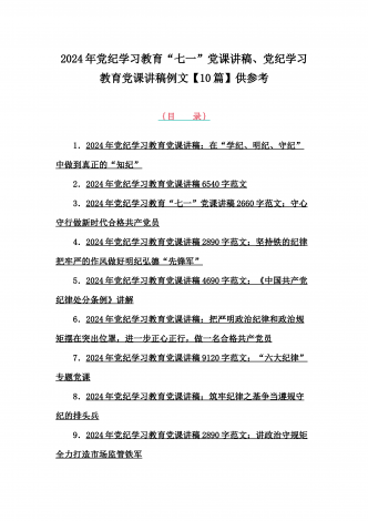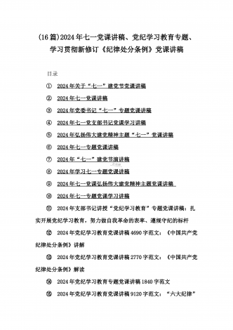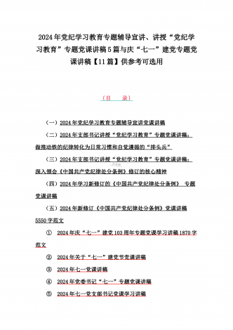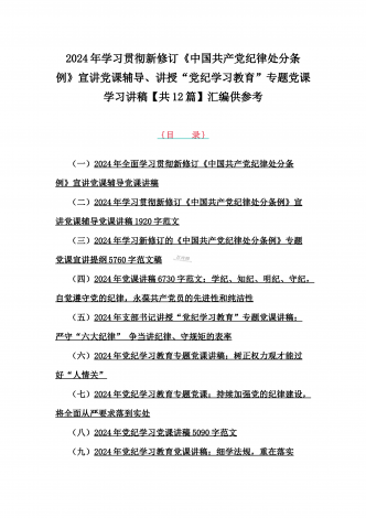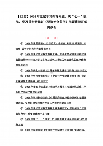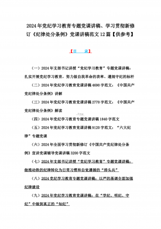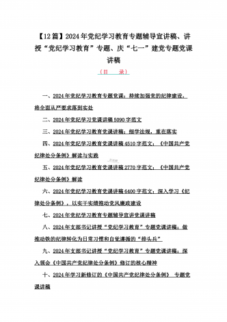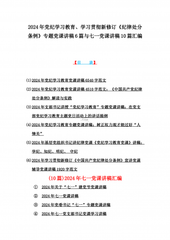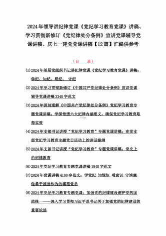 2024年领导讲纪律党课《党纪学习教育党课》讲稿、学习贯彻新修订《党纪律处分条例》宣讲党课辅导党课讲稿、庆七一建党党课讲稿【12篇】汇编供参考{目录}(1)2024年基层党组织书记讲纪律党课《党纪学习教育党课》讲稿:学纪、知纪、明纪、守纪(2)2024年学习贯彻新修订《中国共产党纪律处分条例》宣讲党课辅导党课讲稿3340字范文(3)2024年深刻理解《中国共产党纪律处分条例》党纪学习教育专题党课讲稿:学深悟透六大纪律内涵要义,确保党纪学习教育取得实效(4)2024年支部书记讲授“党纪学习教育”专...