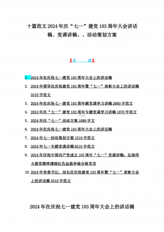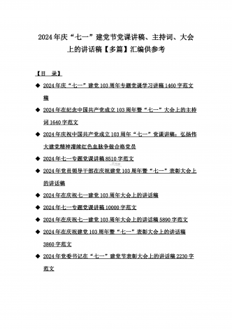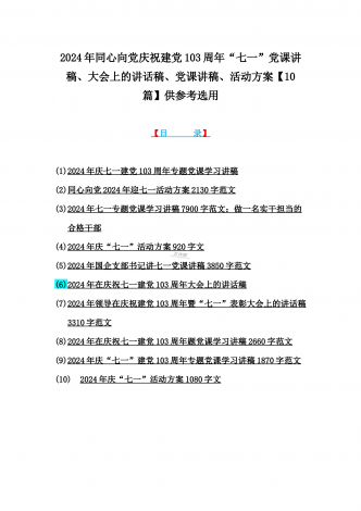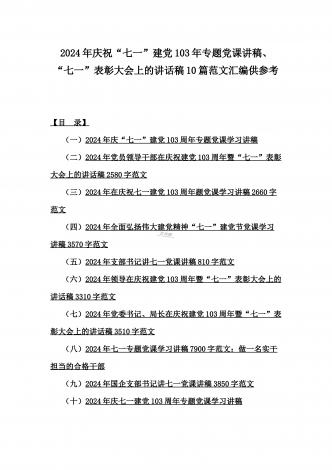2024年在庆祝七一建党103周年大会上的讲话稿【7篇】与弘扬伟大建党精神“七一”建党节党课讲稿(10篇) 汇编供参考