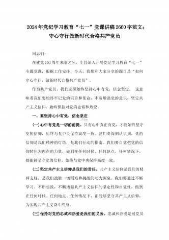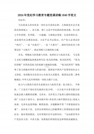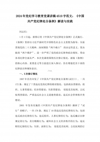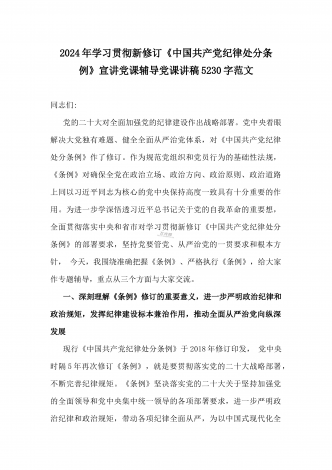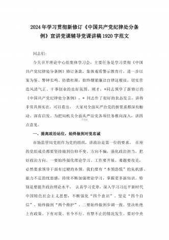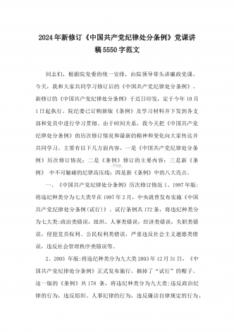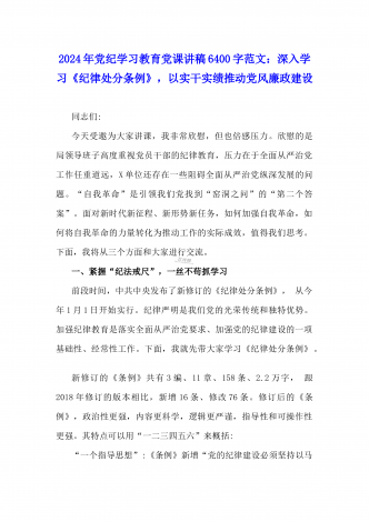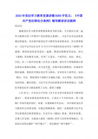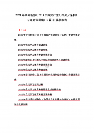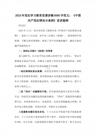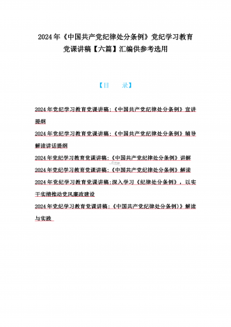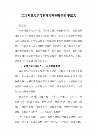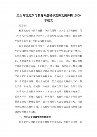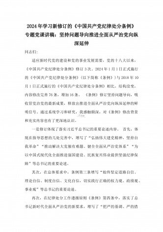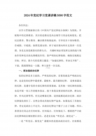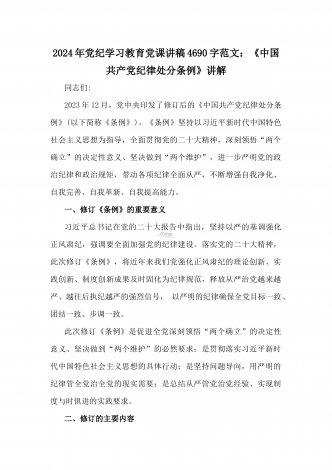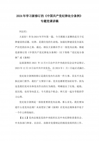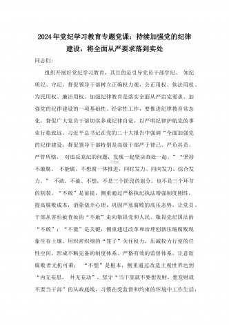 2024年党纪学习教育专题党课:加强党的纪律建设维护党的团结统一——深入学习贯彻习近平总书记关于加强党的纪律建设的重要论述同志们:我们党是靠革命理想和铁的纪律组织起来的马克思主义政党,纪律严明是我们党的光荣传统和独特优势。党的十八大以来,习近平同志就加强新形势下党的纪律建设作出一系列重要论述。这些重要论述,既与马克思列宁主义、毛泽东思想和中国特色社会主义理论体系关于纪律建设的思想一脉相承,又在中国特色社会主义新的伟大实践中丰富和发展了党的纪律建设理论,具有鲜明的中国特色和与时俱进的理论品质,标志...