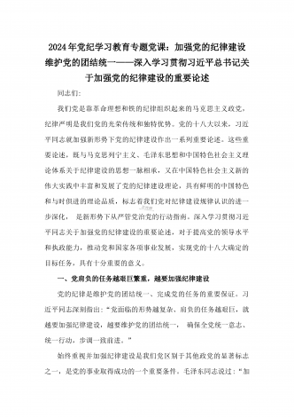 2024年党纪学习教育专题党课:加强党的纪律建设维护党的团结统一——深入学习贯彻习近平总书记关于加强党的纪律建设的重要论述
