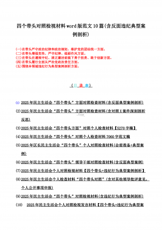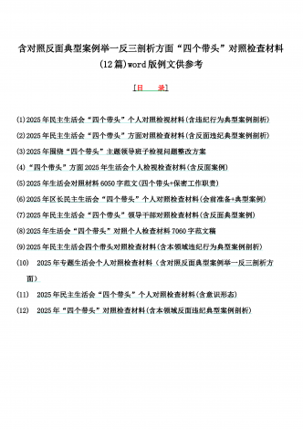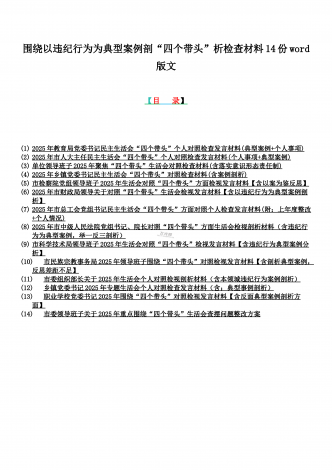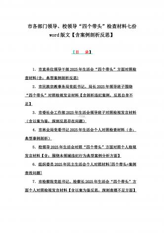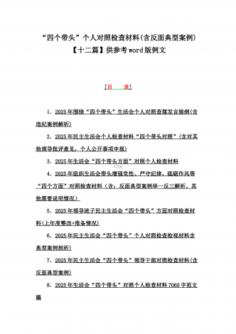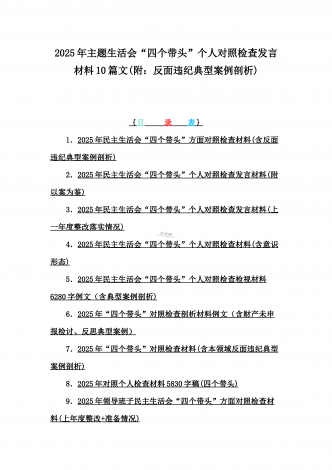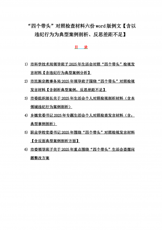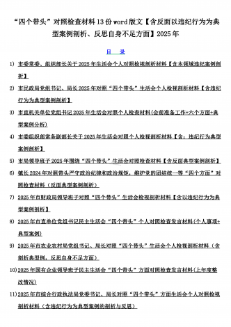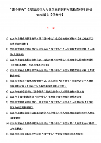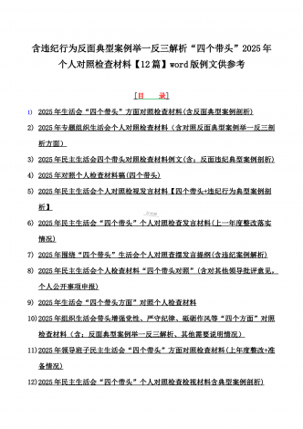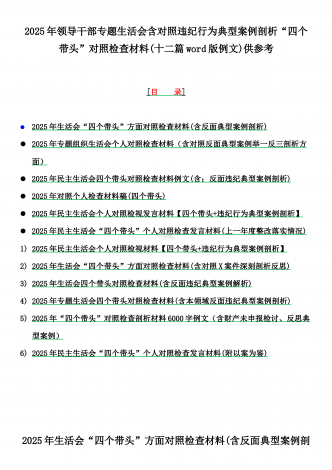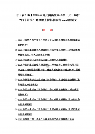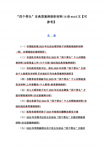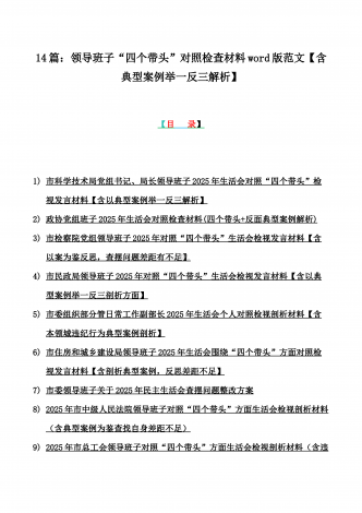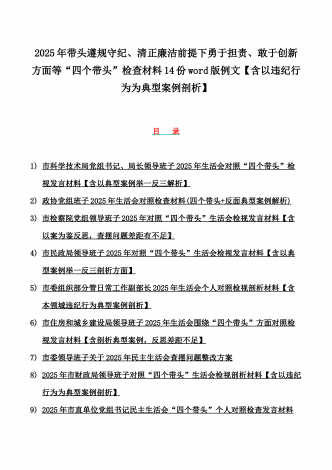 2025年带头遵规守纪、清正廉洁前提下勇于担责、敢于创新方面等“四个带头”检查材料14份word版例文【含以违纪行为为典型案例剖析】目录1)市科学技术局党组书记、局长领导班子2025年生活会对照“四个带头”检视发言材料【含以典型案例举一反三解析】2)政协党组班子2025年生活会对照检查材料(四个带头+反面典型案例解析)3)市检察院党组领导班子2025年对照“四个带头”生活会检视发言材料【含以案为鉴反思,查摆问题差距有不足】4)市民政局领导班子2025年对照“四个带头”生活会检视发言材料【含以典型...