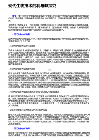 现代生物技术的利与弊探究 摘要:我们在挖掘生物技术潜在推动力的同时,也应该对生物技术发展可能带来的弊端进行剖析,只有这样,才能够保证生物技术在人类发展历史上发挥出积极作用,推动人类历史的发展。生物技术,并不完全是一个新生事物,生物技术可以区分为传统生物技术和现代生物技术两种,现代生物技术包括农业生物技术、医学生物技术、海洋生物技术等等。生物技术,就是利用已经发现的生物或者是生物的一部分材料,对商品进行改进的技术。 1 现代生物技术的利现代生物技术的迅猛发展,它为人类社会经济的整体发展做出了巨...