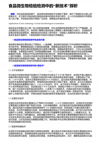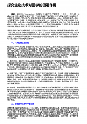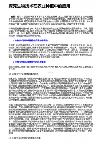 探究生物技术在农业种植中的应用 摘要:现如今,我国科学技术水平有了大幅度的提升,这为生物技术的发展提供了良好的契机,使生物技术得到了广泛的推广和应用,在农业种植领域也是如此。借助生物技术,不仅可以提高农业种植的效率,还可以促进农业种植质量的进一步提升,实现我国农业的可持续发展。本文就对农业种植中生物技术的应用进行了深入探究,旨在为相关从业人员提供参考与帮助。作为我国的基础性产业之一,农业对我国的经济和社会的发展有着极其重要的影响。为此,我国采取了多种措施和手段,致力于农业生产水平的提高,生物技术...
