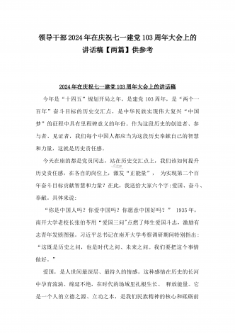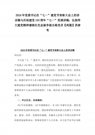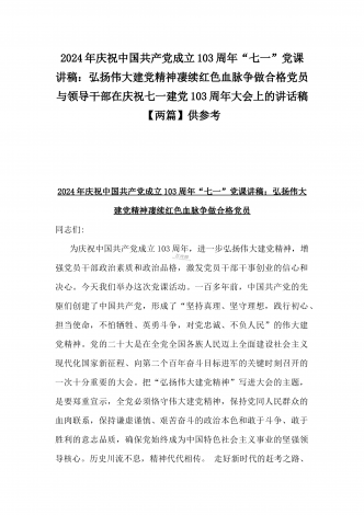 2024年庆祝中国共产党成立103周年“七一”党课讲稿:弘扬伟大建党精神凄续红色血脉争做合格党员与领导干部在庆祝七一建党103周年大会上的讲话稿【两篇】供参考