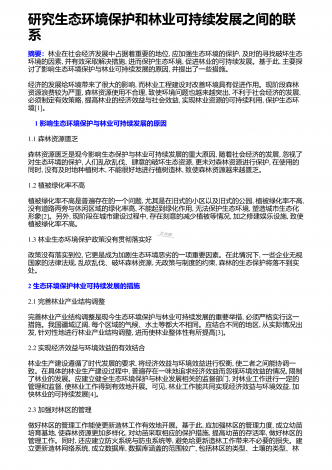 研究生态环境保护和林业可持续发展之间的联系摘要:林业在社会经济发展中占据着重要的地位,应加强生态环境的保护,及时的寻找破坏生态环境的因素,并有效采取解决措施,进而保护生态环境,促进林业的可持续发展。基于此,主要探讨了影响生态环境保护与林业可持续发展的原因,并提出了一些措施。经济的发展给环境带来了很大的影响,而林业工程建设对改善环境具有促进作用。现阶段森林资源浪费较为严重,森林资源使用不合理,致使环境问题也越来越突出,不利于社会经济的发展,必须制定有效策略,提高林业的经济效益与社会效益,实现林业资...