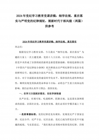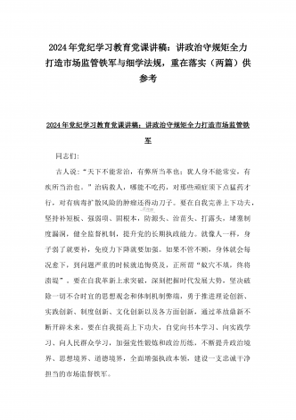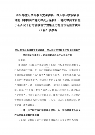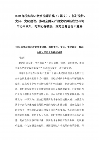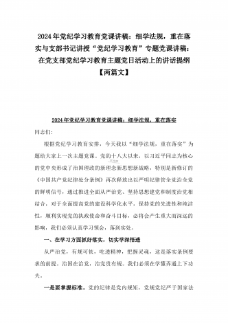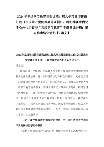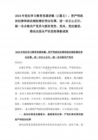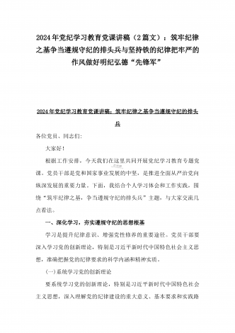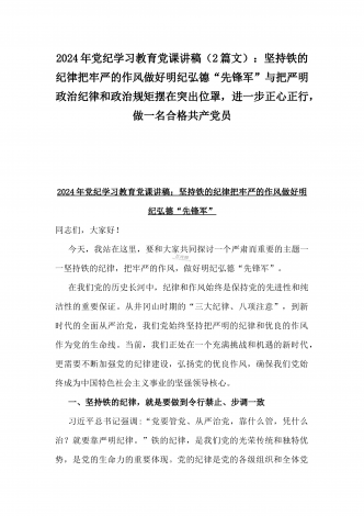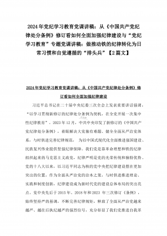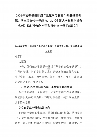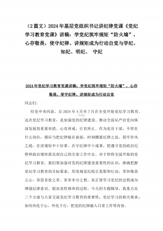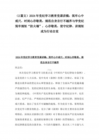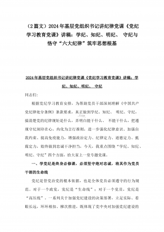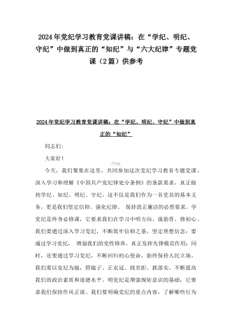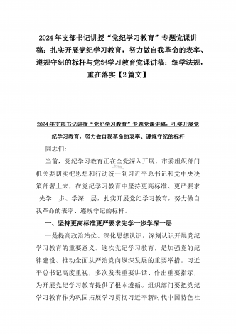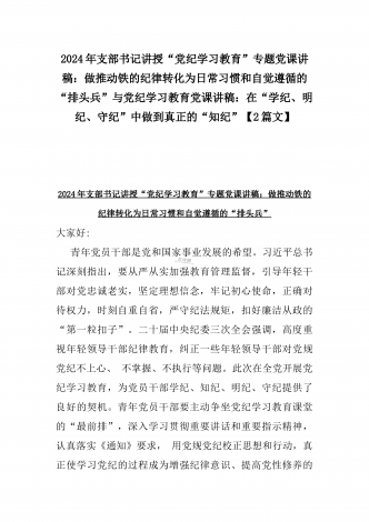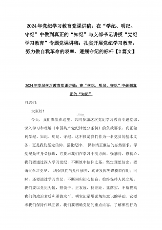 2024年党纪学习教育党课讲稿:在“学纪、明纪、守纪”中做到真正的“知纪”与支部书记讲授“党纪学习教育”专题党课讲稿:扎实开展党纪学习教育,努力做自我革命的表率、遵规守纪的标杆【2篇文】