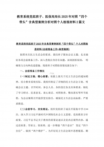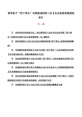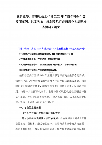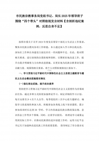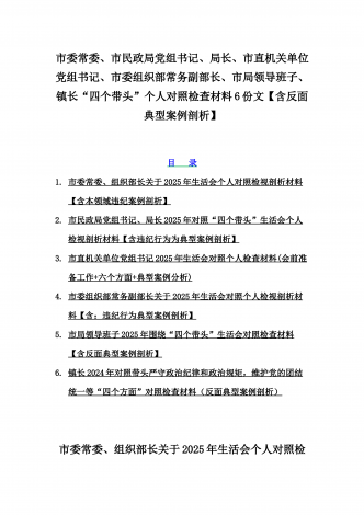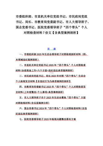 市委组织部、市直机关单位党组书记、市民政局党组书记、局长、市教育局党委副书记、市人大领导班子、国企党委书记、医院党委领导班子“四个带头”个人对照检查材料7份文【含典型案例剖析】目录一、市委组织部2025年生活会领导班子对照检视剖析材料(附:本领域违纪案例剖析)二、市直机关单位党组书记2025年“四个带头”个人对照检查材料(会前准备工作+六个方面+违纪违法典型案例剖析)三、市民政局党组书记、局长2025年对照“四个带头”生活会个人检视发言材料【含违纪行为为典型案例的剖析】四、市教育局党委副书记20...