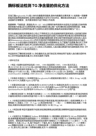 酶标板法检测TG净含量的优化方法甘油三酯(triglyceride,TG)是人体内含量最多的脂类,是体内能量的主要来源.TG检测是一项重要的临床血脂常规测定指标.血清甘油酯测定方法可分为化学法、酶标板法和色谱法3大类.化学法因操作步骤繁多、技术要求高而不适于常规工作应用.核素稀释/气相色谱/质谱技术(ID/GC/MS)主要用作参考系统中决定性方法的建立及参考物质的制备与定值,该方法费用昂贵,样品处理复杂,难以推广应用.酶标板法具有简便快速、微量、精密度高的优点,且特异性强,易于达到终点,线性范围...