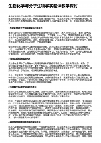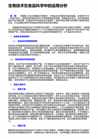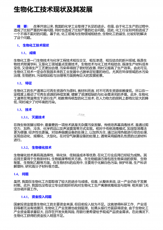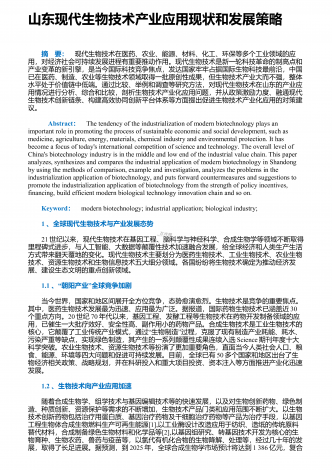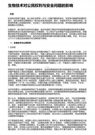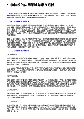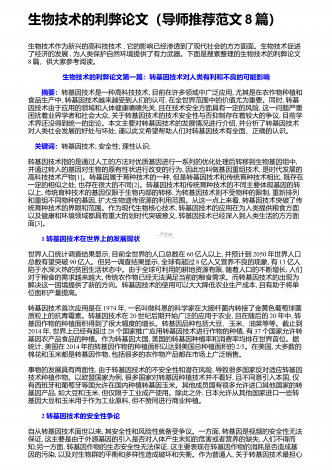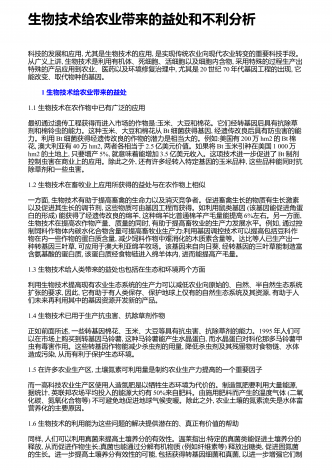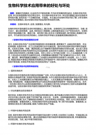 生物科学技术应用带来的好处与坏处 摘要:随着时代的脚步,社会经济正不断地发展,作为科学发展的领先前沿,生物科学技术的应用,早已经渗透到我们的日常生活中。在生物科学技术学习中,学生首先要建立起对生物技术研究的兴趣,进而形成一个正确的态度、价值观。本文通过对生物科学技术的了解,分析生物科学技术的发展情况,探讨生物科学技术的应用所带来的利与弊。 关键词:生物科学技术;应用;发展情况;利与弊;生物科学技术是构建在生命科学的基础上,通过生物、生物组织以及生物细胞等特点、功能,进行设计、建立新的物质、品系,...