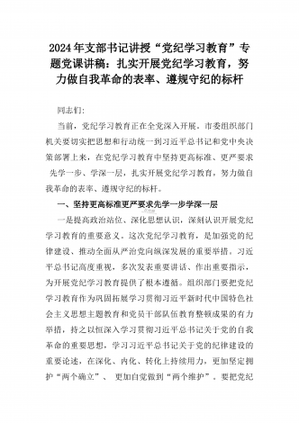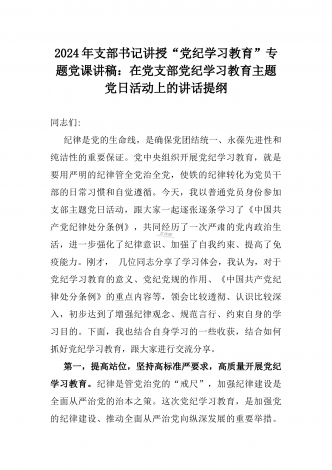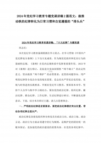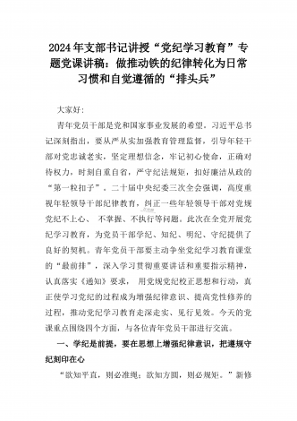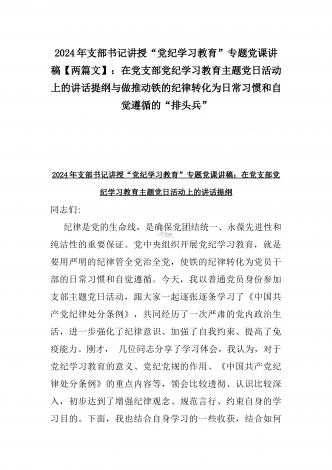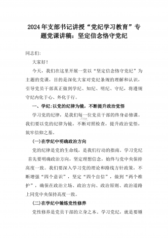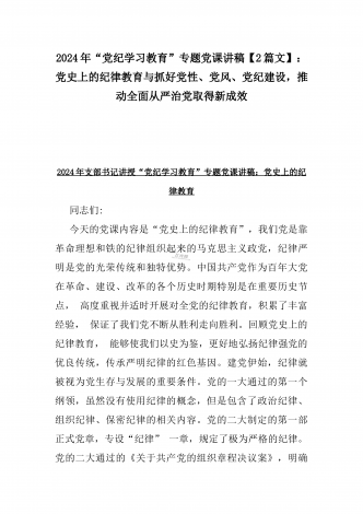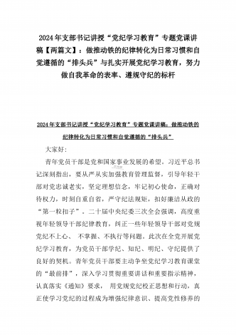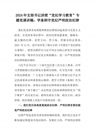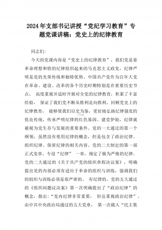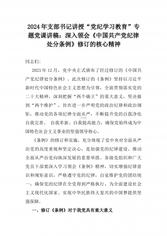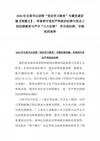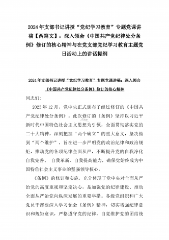 2024年支部书记讲授“党纪学习教育”专题党课讲稿【两篇文】:党史上的纪律教育与严守“六大纪律” 争当讲纪律、守规矩的表率与深入领会《中国共产党纪律处分条例》修订的核心精神