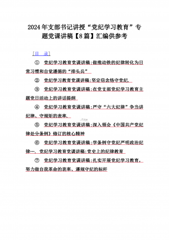 2024年支部书记讲授“党纪学习教育”专题党课讲稿【两篇文】:党史上的纪律教育与严守“六大纪律”争当讲纪律、守规矩的表率与深入领会《中国共产党纪律处分条例》修订的核心精神2024年支部书记讲授“党纪学习教育”专题党课讲稿:党史上的纪律教育同志们:今天的党课内容是“党史上的纪律教育”,我们党是靠革命理想和铁的纪律组织起来的马克思主义政党,纪律严明是党的光荣传统和独特优势。中国共产党作为百年大党在革命、建设、改革的各个历史时期特别是在重要历史节点,高度重视并适时开展对全党的纪律教育,积累了丰富经验,...