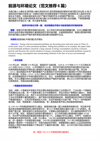 能源与环境论文(范文推荐6篇)当我们踏入小康生活,享受着小康生活的快乐时,是否想到能源问题和环境问题已经出现.水,电,石油危机和环境的污染等,这一切都在向我们诉说着资源是不可再生的,是有限的,而人类的生存却是生生不息的。对森林滥砍滥伐,对矿产毫无节制的开采,……水资源的严重污染已经让当代的我们尝到了苦果.合理利用资源,保护我们赖以生存发展的生存环境已迫在眉睫。下面是搜索整理的能源与环境论文6篇,供大家参考阅读。 能源与环境论文第一篇:浅谈我国经济增长与能源消耗对环境的影响 摘要:能源与环境问题...