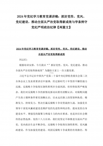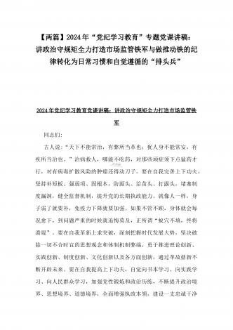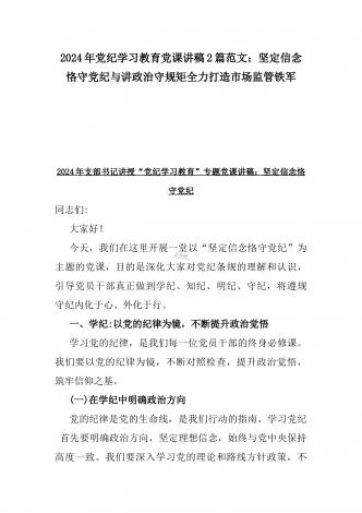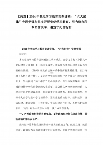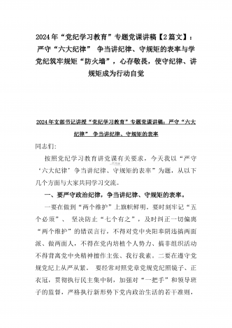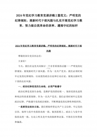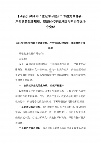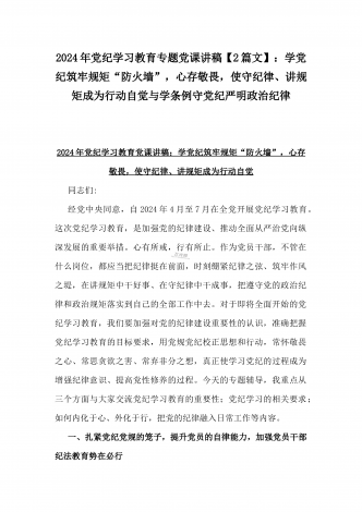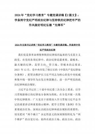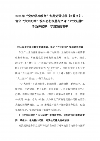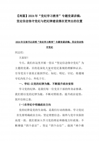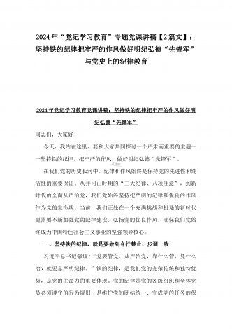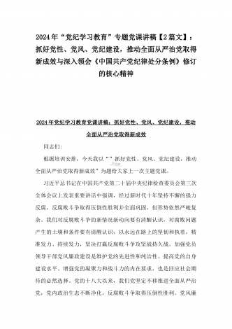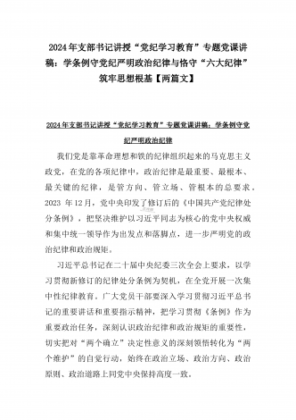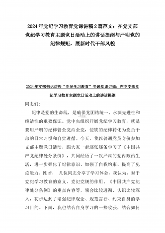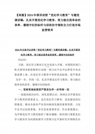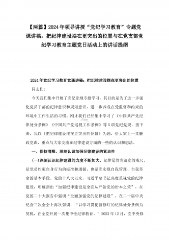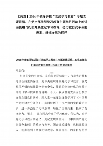 【两篇】2024年领导讲授“党纪学习教育”专题党课讲稿:在党支部党纪学习教育主题党日活动上的讲话提纲与扎实开展党纪学习教育,努力做自我革命的表率、遵规守纪的标杆