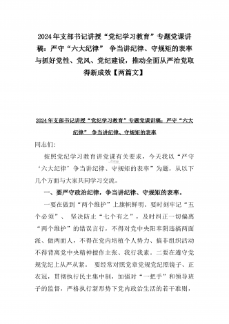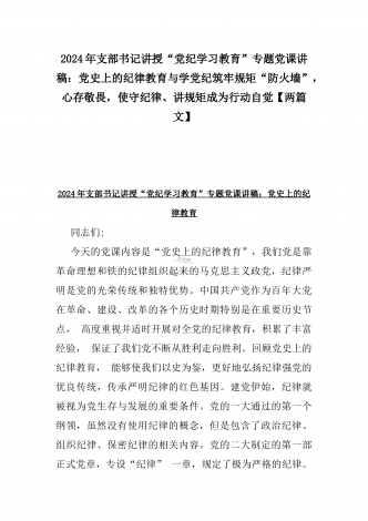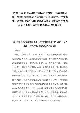 2024年支部书记讲授“党纪学习教育”专题党课讲稿:学党纪筑牢规矩“防火墙”,心存敬畏,使守纪律、讲规矩成为行动自觉与深入领会《中国共产党纪律处分条例》修订的核心精神【两篇文】