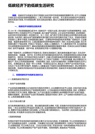 低碳经济下的低碳生活研究 摘要:低碳经济与低碳生活对于我国社会经济的可持续发展具有重要作用,对于公民健康文明生活方式的形成具有重要意义,二者之间存在着一定关系。本文首先对低碳经济与低碳生活的关系进行探索,针对探索结果,结合当前实际情况,提出几点能够发展低碳经济与低碳生活的方法。 一、低碳经济与低碳生活的关系在2003年5月的英国能源白皮书中,低碳经济一词首次出现,其内涵至今没有被明确界定,当前,我国学术界认为低碳经济可以节省能源,减少温室气体排放,让社会经济保持稳定,促进我国社会经济的可持...