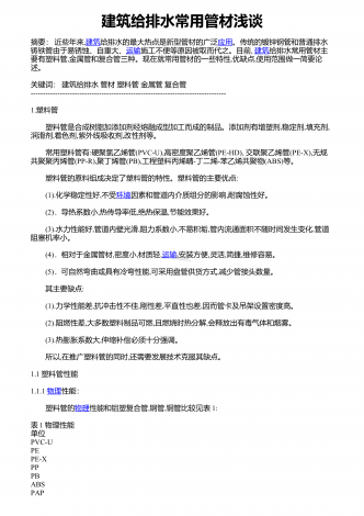 建筑给排水常用管材浅谈摘要:近些年来,建筑给排水的最大热点是新型管材的广泛应用。传统的镀锌钢管和普通排水铸铁管由于易锈蚀、自重大、运输施工不便等原因被取而代之。目前,建筑给排水常用管材主要有塑料管,金属管和复合管三种。现在就常用管材的一些特性,优缺点,使用范围做一简要论述。关键词:建筑给排水管材塑料管金属管复合管--------------------------------------------------------------------------------1.塑料管塑料管是合成树脂...