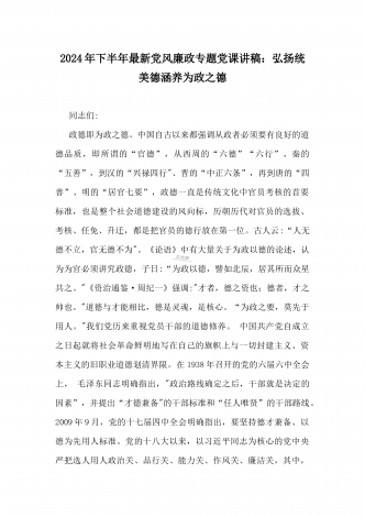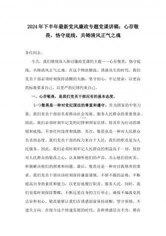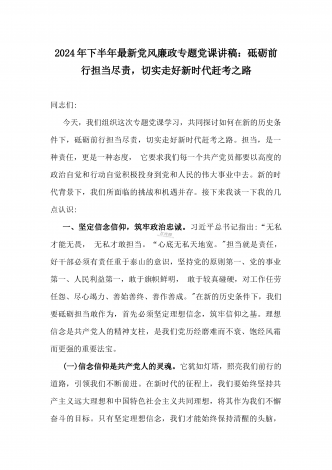 2024年下半年最新党风廉政专题党课讲稿:砥砺前行担当尽责,切实走好新时代赶考之路同志们:今天,我们组织这次专题党课学习,共同探讨如何在新的历史条件下,砥砺前行担当尽责,切实走好新时代赶考之路。担当,是一种责任,更是一种态度,它要求我们每一个共产党员都要以高度的政治自觉和行动自觉积极投身到党和人民的伟大事业中去。新的时代背景下,我们所面临的挑战和机遇并存。接下来我谈一下我的几点认识:一、坚定信念信仰,筑牢政治忠诚。习近平总书记指出:“无私才能无畏,无私才敢担当。“心底无私天地宽。"担当就是责任,...