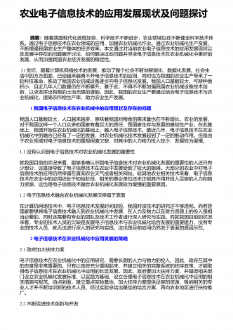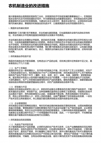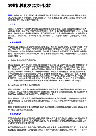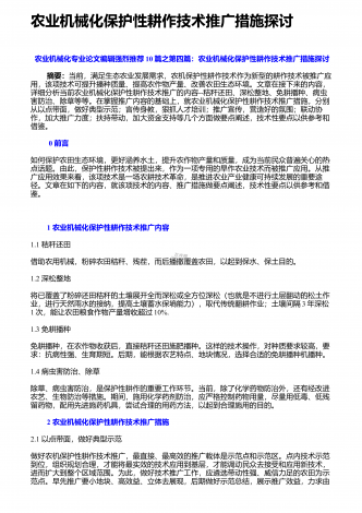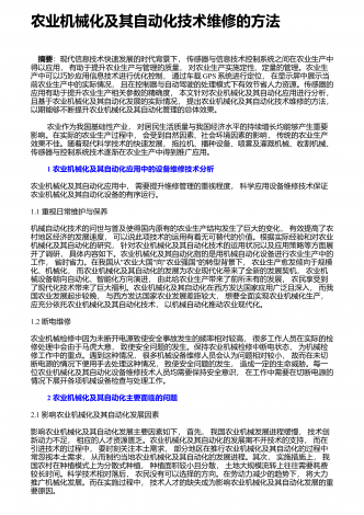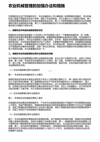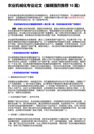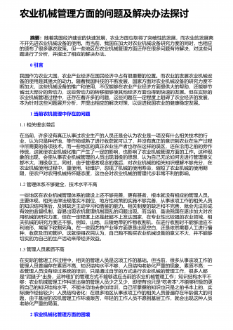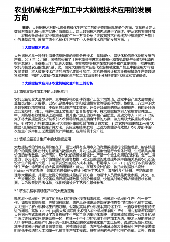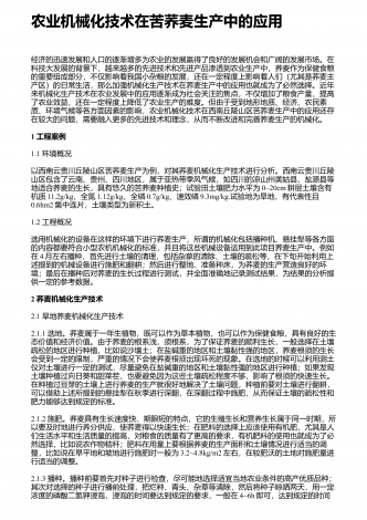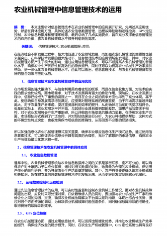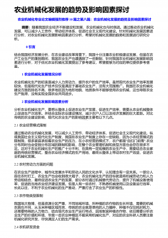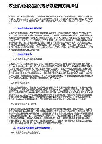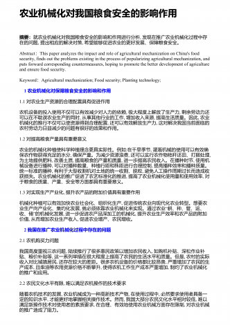 农业机械化新技术与新机具的运用研究摘要:我国是农业大国,农业人口占我国总人口的50%以上。近年来,我国的农业生产技术在不断地更新和进步,相比以往的农业生产方式,我国已经实现了机械化生产模式的普及,我国的农业机械化技术水平也在不断提高。农业机械化新技术和新机具的应用,不仅使生产效率得到了有效的提高,而且大大减轻了农民的生产强度。因此,加强对农业机械化新技术和新机具的应用,对于我国的农业生产具有重要意义。基于此,本文分别从农作物生产、水果蔬菜生产、畜牧生产及环境保护等方面,就农业机械化新技术和新机具...