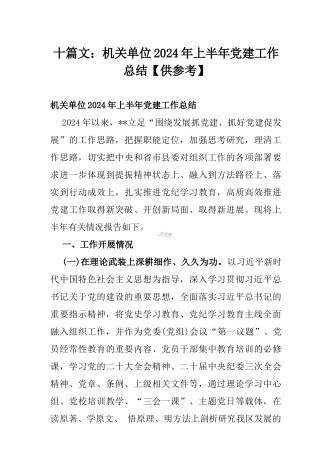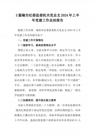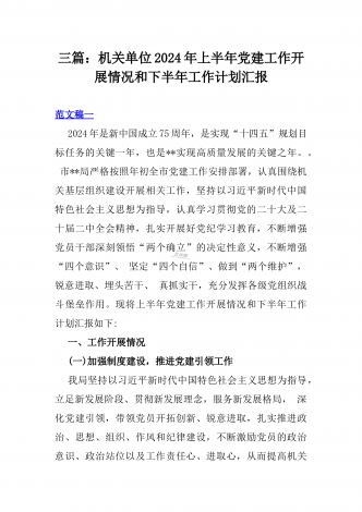 机关单位2024年上半年党建工作开展情况及下半年工作计划汇报材料三份2024年是新中国成立75周年,是实现“十四五”规划目标任务的关键一年,也是**实现高质量发展的关键之年。。市**局严格按照年初全市党建工作安排部署,认真围绕机关基层组织建设开展相关工作,坚持以习近平新时代中国特色社会主义思想为指导,认真学习贯彻党的二十大及二十届二中全会精神,扎实开展好党纪学习教育,不断增强党员干部深刻领悟“两个确立”的决定性意义,不断增强“四个意识”、坚定“四个自信”、做到“两个维护”,锐意进取、埋头苦干、真...
