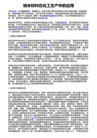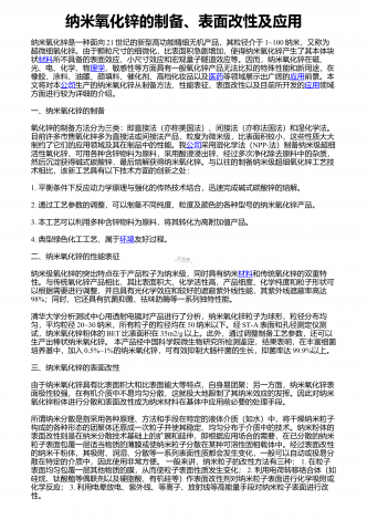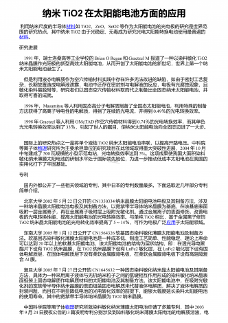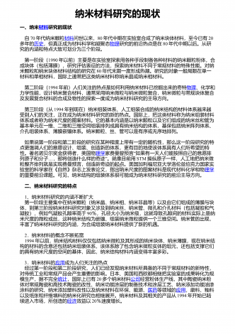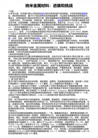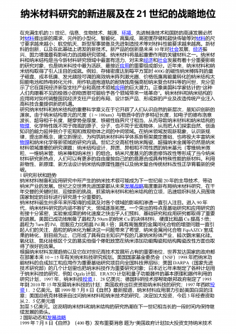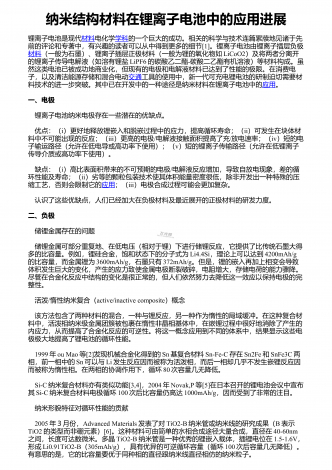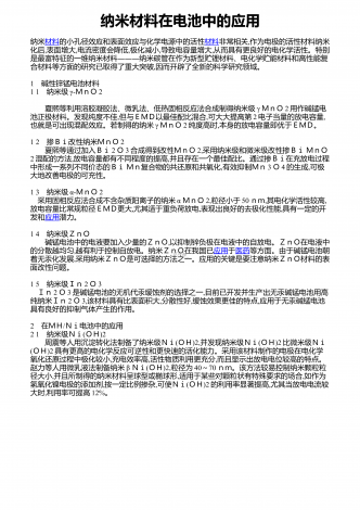 纳米材料在电池中的应用纳米材料的小孔径效应和表面效应与化学电源中的活性材料非常相关,作为电极的活性材料纳米化后,表面增大,电流密度会降低,极化减小,导致电容量增大,从而具有更良好的电化学活性。特别―――是最富特征的一维纳米材料纳米碳管在作为新型贮锂材料、电化学贮能材料和高性能复合材料等方面的研究已取得了重大突破,因而开辟了全新的科学研究领域。1碱性锌锰电池材料11纳米级γ-MnO2夏熙等利用溶胶凝胶法、微乳法、低热固相反应法合成制得纳米级γMnO2用作碱锰电池正极材料。发现纯度不佳,但与EMD以...