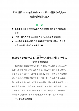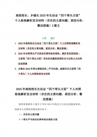 高校校长、乡镇长2025年生活会“四个带头方面”个人检视解析发言材料(存在的主要问题、原因分析、整改措施)3篇文