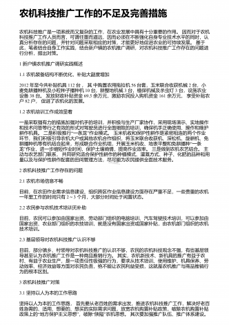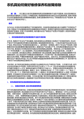 农机具如何做好维修保养和故障排除 摘 要:本文通过分析农机具维修保养及其故障排除不当的不良影响,结合实际情况对如何有效开展相关工作进行了详细的说明,希望能够帮助有关单位及农机具使用者,使其不断提升对农机具维修保养及故障排除的重视,改善当前维修养护状况,不断提高农业生产的效率,增加农业生产者的经济收入。 前言当今社会,科学技术的发展带动了农机具的研发,大批新型设备的诞生极大地便利了农民的生产生活,但是由于对设备维修保养及故障排除技术的缺乏,使得其不能有效对相关机械设备进行有效的养护及维修...