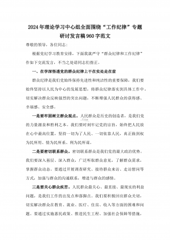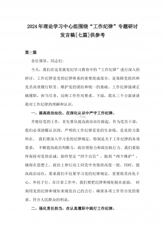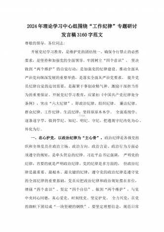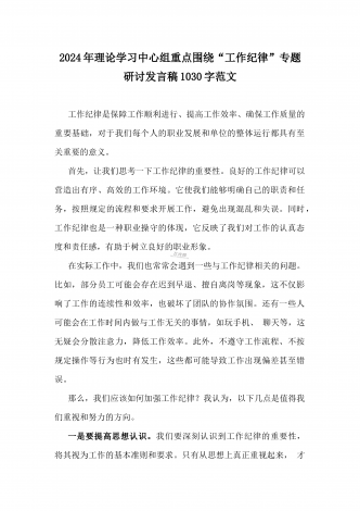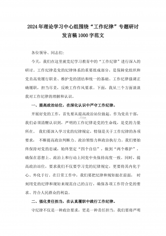 2024年理论学习中心组全面重点围绕“工作纪律”专题研讨发言稿1990字范文