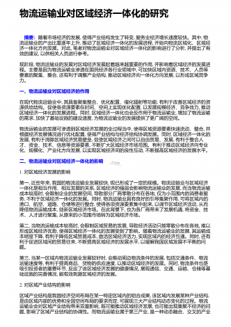物流运输业对区域经济一体化的研究 摘要:随着市场经济的发展,使得产业结构发生了转变,服务业经济增长速度较快。其中,物流运输业的产出比重逐年上升,推动了区域经济一体化的发展进程,开始向物流区域化、区域经济一体化方向发展。对此,笔者对物流运输业对区域经济一体化的影响进行了分析,并提出了有效的建议,以供相关人员进行参考。现阶段,物流运输业的发展对区域经济发展起着越来越重要的作用,并影响着区域经济的发展进程。主要是因为物流运输业渗透在国民经济各行业领域中,可加快区域内资源、技术、人员等要素的聚集、整合,...
