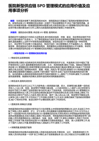 医院新型供应链SPD管理模式的应用价值及应用事项分析 摘要:在新医改背景下,降低医用耗材成本、提高医院运行质量成了医用耗材管理的研究热点。新型供应链SPD管理模式的出现进一步提升了供应链管理水平,优化了医疗服务质量。该研究以蚌埠医学院第一附属医院医用耗材管理为例,对新型供应链SPD管理模式的应用价值及应用中需注意的事项进行分析,以期为当前医院的医用耗材管理工作提供参考。 关键词:医院自动化管理;供应链SPD管理;医用耗材;医用耗材作为医院运行中的巨大运营成本,其中的耗材选择、存储、配送、供应等供...