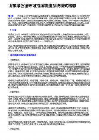 山东绿色循环可持续物流系统模式构想摘 要: 近些年, 山东省物流基础设施逐渐健全, 物流发展速度日益提高, 物流与山东省经济相结合, 一定程度上促进了山东经济的快速发展。然而, 物流系统的发展却不合理, 这不仅造成了资源浪费和环境污染, 更给山东省整体经济的可持续发展造成了阻碍, 不利于经济未来的健康发展。为此, 不能单靠物流的发展去拉动经济, 更要建立在绿色循环可持续的基础上来进行, 完善绿色循环的物流系统, 才能提高山东物流发展的韧性, 进而促进山东经济的健康平稳发展。 0 引言物流自上...