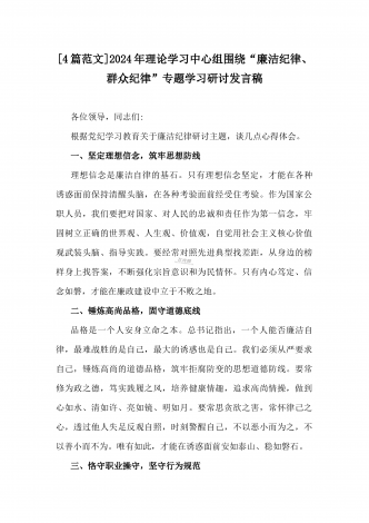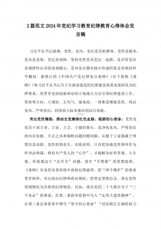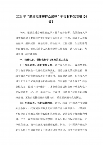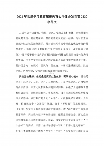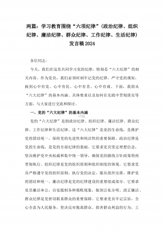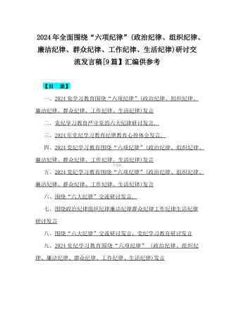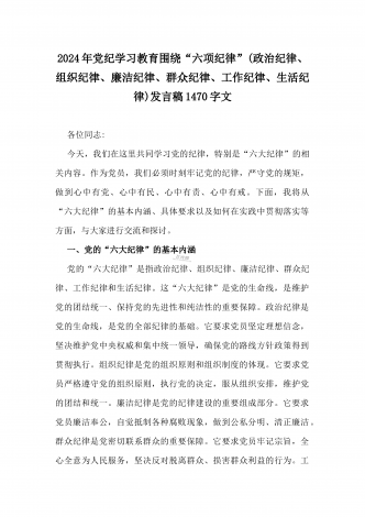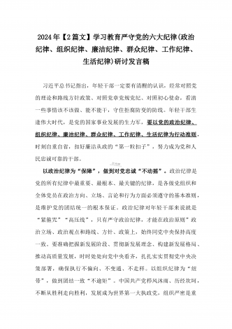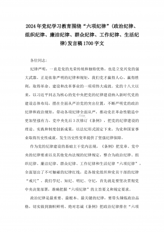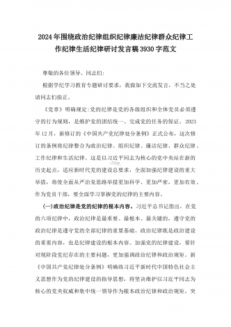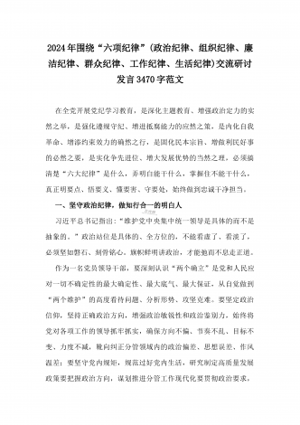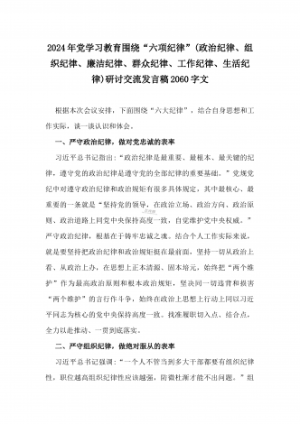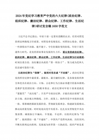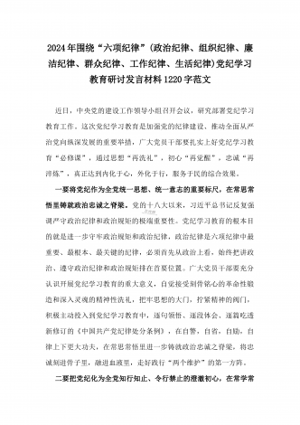 2024年围绕“六项纪律”(政治纪律、组织纪律、廉洁纪律、群众纪律、工作纪律、生活纪律)党纪学习教育研讨发言材料1220字范文