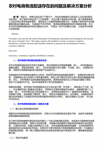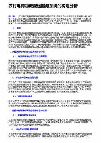 农村电商物流配送服务系统的构建分析摘 要: 农村电子商务是互联网发展衍生的新领域, 应建设农村物流配送运营服务体系, 由市级、县级以及乡镇实现贸易互通, 最终实现全国农村电子商务信息联网。具体来说, 一方面, 以县级市为中心的运营服务建设要引进电子商务企业, 并与之进行合作, 另一方面, 还要增加乡镇服务以及村级的服务站点, 做好仓储以及配送工作, 为农民致富奠定良好的基础。 0 、引言农村经济发展以及农民增收已经成为政府关注的热点问题。但是, 由于受多方面因素的影响, 我国农村经济受...