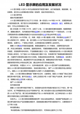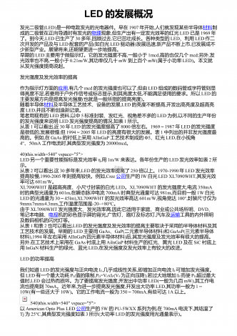 LED的发展概况发光二极管(LED)是一种电致发光的光电器件。早在1907年开始,人们就发现某些半导体材料制成的二极管在正向导通时有发光的物理现象,但生产出有一定发光效率的红光LED已是1969年了。到今天,LED已生产了30多年,回顾过去,它已茁壮成长。各种类型的LED、利用LED作二次开发的产品及与LED配套的产品(如白光LED驱动器)发展迅速,新产品不断上市,已发展成不少新型产业。展望将来,还期望更进一步地提高。早期的LED主要用于做指示灯。它的发光强度不高,一般小于1mcd,高的也仅几个...