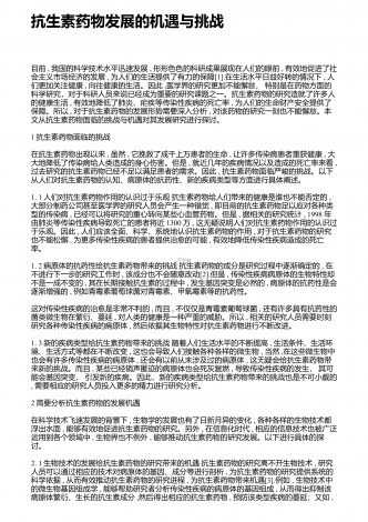 抗生素药物发展的机遇与挑战目前,我国的科学技术水平迅速发展,形形色色的科研成果展现在人们的眼前,有效地促进了社会主义市场经济的发展,为人们的生活提供了有力的保障[1].在生活水平日益好转的情况下,人们更加关注健康,向往健康的生活。因此,医学界的研究更加不能懈怠,特别是在药物方面的科学研究,对于科研人员来说已经成为重要的研究课题之一。抗生素药物的研究造就了许多人的健康生活,有效地降低了肺炎、疟疾等传染性疾病的死亡率,为人们的生命财产安全提供了保障。所以,对于抗生素药物的发展形势需要深入分析,对该药...