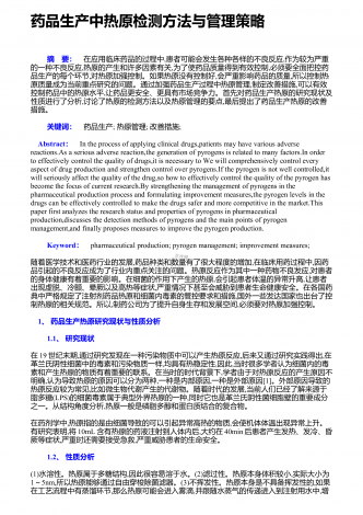 药品生产中热原检测方法与管理策略 摘 要:在应用临床药品的过程中,患者可能会发生各种各样的不良反应,作为较为严重的一种不良反应,热原的产生和许多因素有关,为了使药品质量得到有效控制,必须要全面把控药品生产的每个环节,对热原加强控制。如果热原没有控制好,会严重影响药品的质量,所以控制热原质量成为当前重点研究的问题。通过加强药品生产过程中热原管理,制定改善措施,可以有效控制药品中的热原水平,让药品更安全、更具有市场竞争力。首先对药品生产热原的研究现状及性质进行了分析,讨论了热原的检测方法以...
