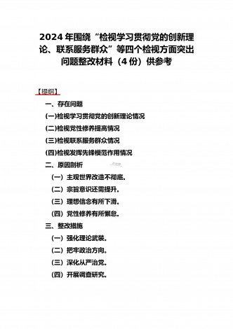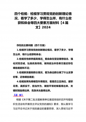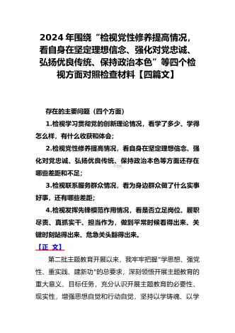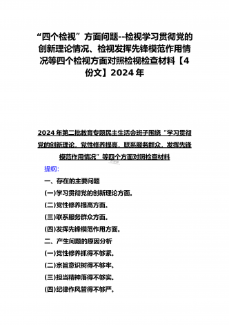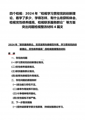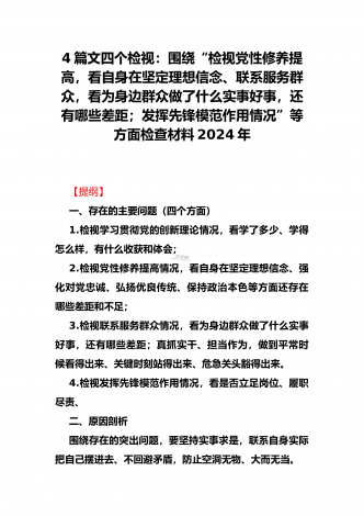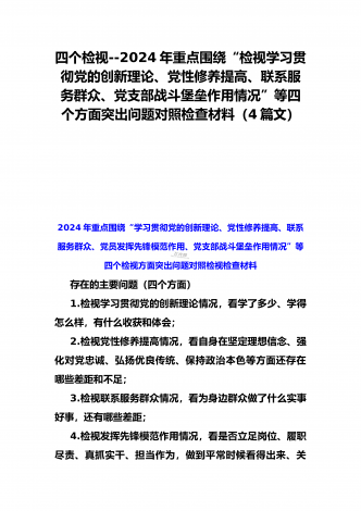 4篇文四个检视:围绕“检视党性修养提高,看自身在坚定理想信念、联系服务群众,看为身边群众做了什么实事好事,还有哪些差距;发挥先锋模范作用情况”等方面检查材料2024年