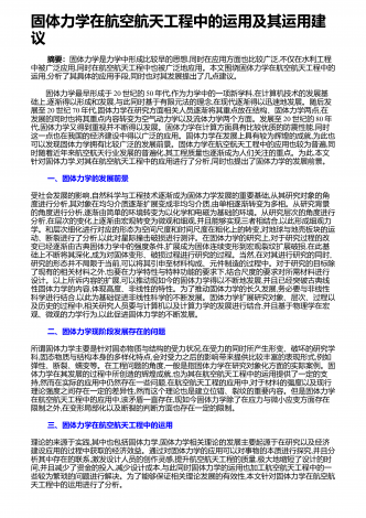 固体力学在航空航天工程中的运用及其运用建议 摘要:固体力学是力学中形成比较早的思想,同时在应用方面也比较广泛,不仅在水利工程中被广泛应用,同时在航空航天工程中也被广泛地应用。本文围绕固体力学在航空航天工程中的运用,分析了其具体的应用手段,同时也对其发展提出了几点建议。固体力学最早形成于20世纪的50年代,作为力学中的一项新学科,在计算机技术的发展基础上,逐渐得以形成和发展,与此同时基于有限元法的理念,在现代逐渐得以迅速地发展。随后发展至20世纪70年代,固体力学在研究方面相关人员逐渐将其重点放...