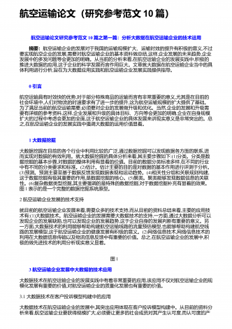 航空运输论文(研究参考范文10篇)航空运输论文研究参考范文10篇之第一篇:分析大数据在航空运输企业的技术运用 摘要:航空运输企业的发展对于我国的运输规模扩大、运输时效的提升有积极的意义,不过要实现航空企业的发展,需要对航空运输企业的基本资料做总结,这样,企业发展的未来趋势,企业发展中的多发问题等会更加的明确。从当前的分析来看,在航空运输企业的发展实践中,积极的推进大数据的应用,这于企业的科学发展而言作用巨大。文章就大数据在航空运输企业当中的具体利用进行分析,旨在为大数据应用实践和航空运输企业发...