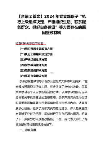 “4个检视”2024年围绕“检视学习贯彻党的创新理论,检视联系服务群众,检视党性修养提高,检视发挥先锋模范作用情况”等方面突出问题检视整改材料【2篇Word版文】供借鉴2024年围绕“学习贯彻党的创新理论、党性修养提高、联系服务群众、党员发挥先锋模范作用”等四个方面突出问题检视整改材料【提纲】一、存在问题(一)检视学习贯彻党的创新理论情况(二)检视党性修养提高情况(三)检视联系服务群众情况(四)检视发挥先锋模范作用情况二、原因剖析(一)主观世界改造不彻底。(二)宗旨意识还需提升。(三)理想信念有...