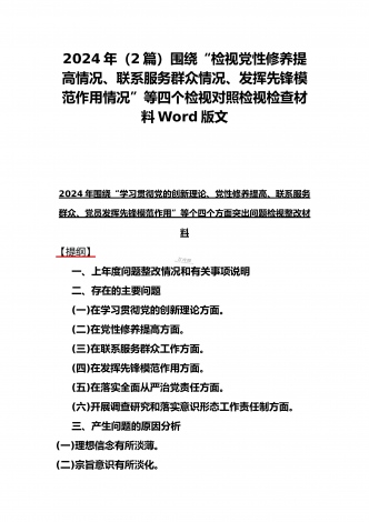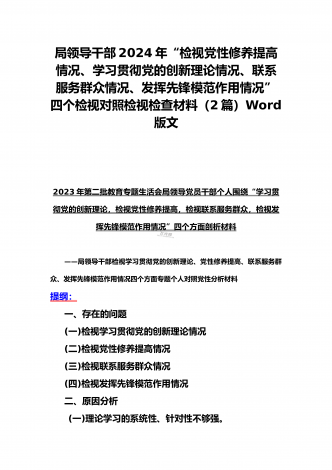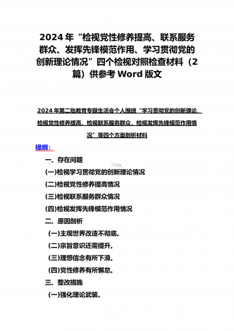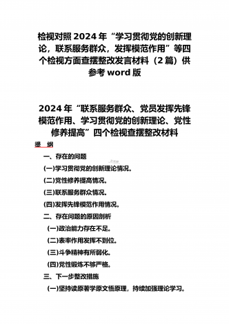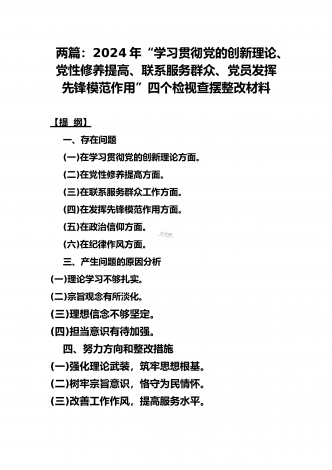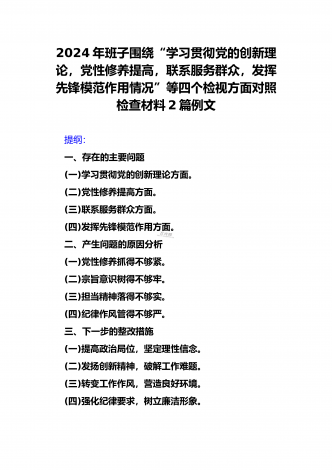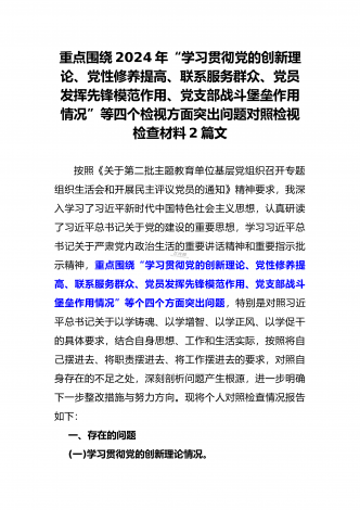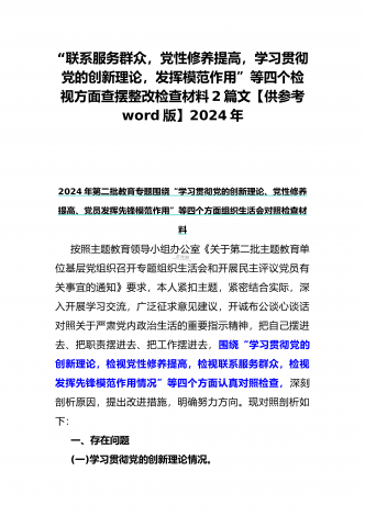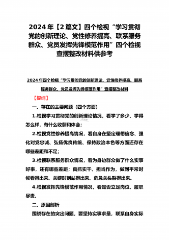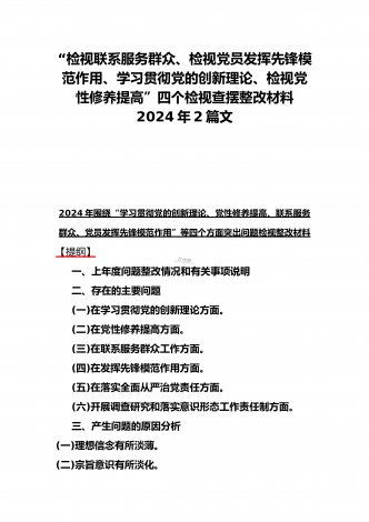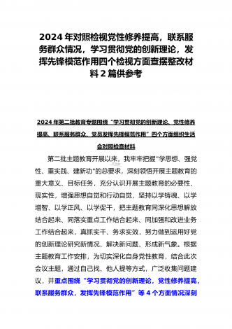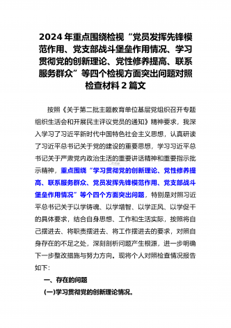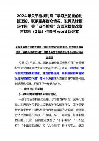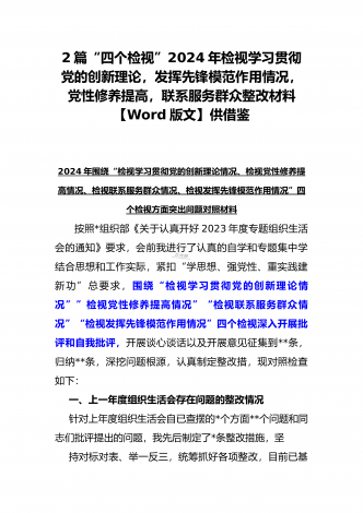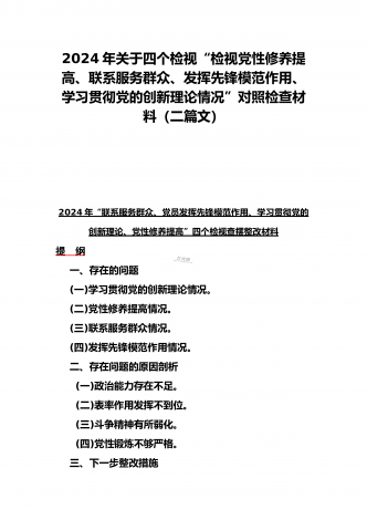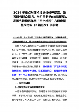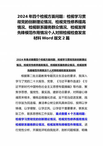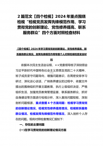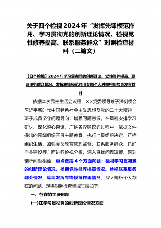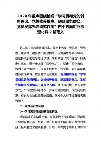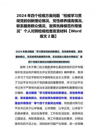 2024年四个检视方面问题:检视学习贯彻党的创新理论情况、检视党性修养提高情况、检视联系服务群众情况、检视发挥先锋模范作用情况个人对照检视检查发言材料Word版文2篇