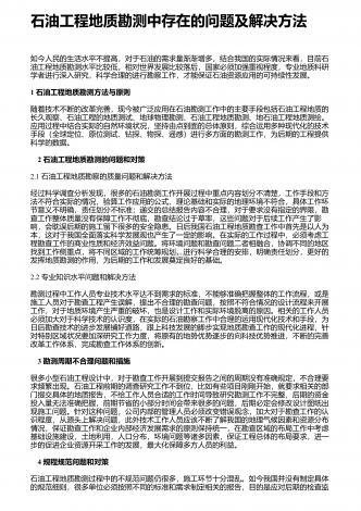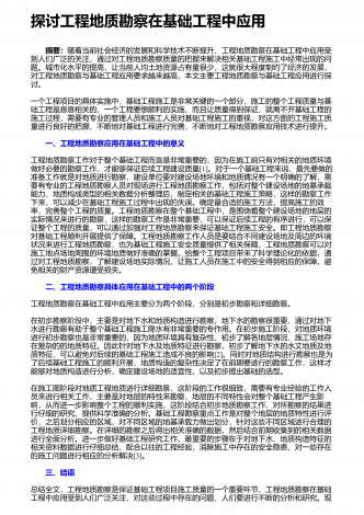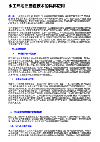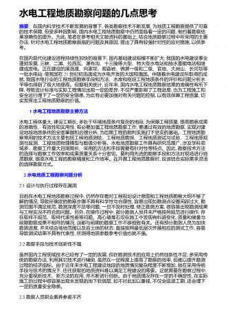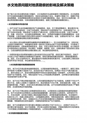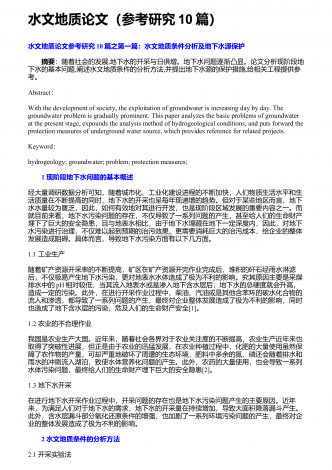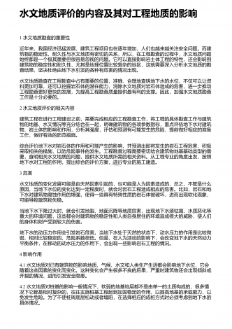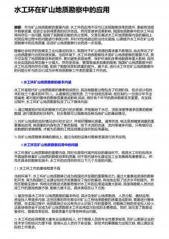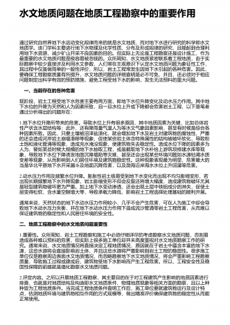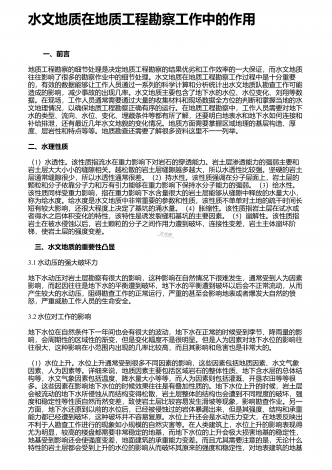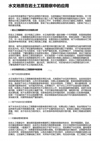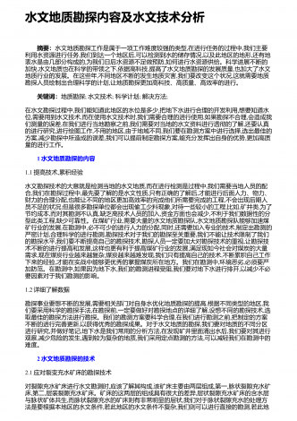 水文地质勘探内容及水文技术分析 摘要:水文地质勘探工作是属于一项工作难度较强的类型,在进行任务的过程中,我们主要利用水资源进行任务,我们到达一个地区后,可以检测到水的储存情况,以及此地区的地形,还有地表水是由几部分构成的,为我们日后水资源不足做预防,如何进行水资源供给。科学进展不断的加快,水文地质也在科学的带领之下,依据高科技,提高了水文地质勘探的发展质量,也加大了水文地质行业的发展。在这些年,不同地区不断的发生地质灾害,我们要改变这个状况,这就需要地质勘探人员绘制出合理科学的计划,让地质勘探...