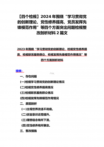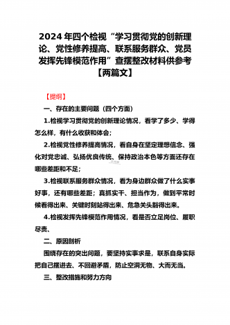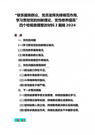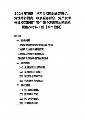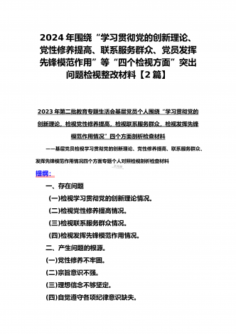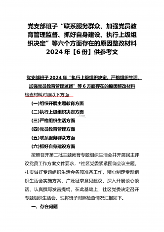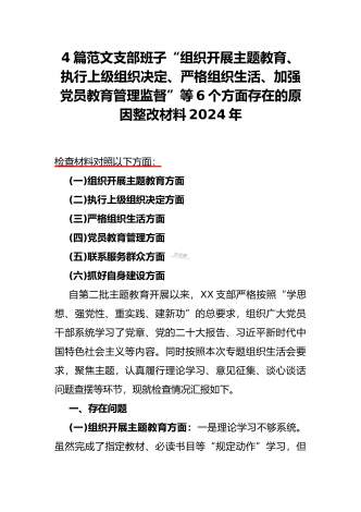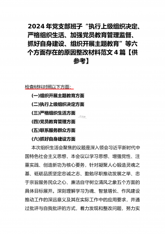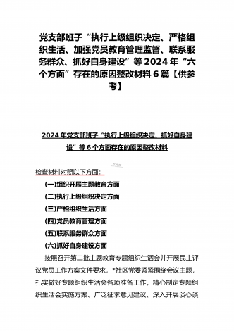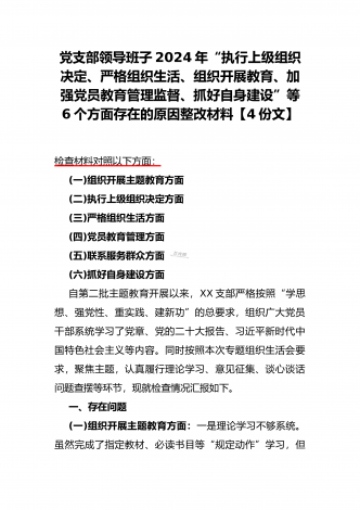 基层领导“执行上级组织决定、严格组织生活、加强党员教育管理监督、联系服务群众、抓好自身建设、组织开展主题教育”等六个方面存在原因整改材料2024年【4篇】供参考2024年党员支部班子领导干部“执行上级组织决定、严格组织生活、加强党员教育管理监督、联系服务群众、抓好自身建设”等方面存在的原因整改材料检查材料对照以下方面:(一)组织开展主题教育方面(二)执行上级组织决定方面(三)严格组织生活方面(四)党员教育管理方面(五)联系服务群众方面(六)抓好自身建设方面根据《关于召开2023年度基层党组织组织...