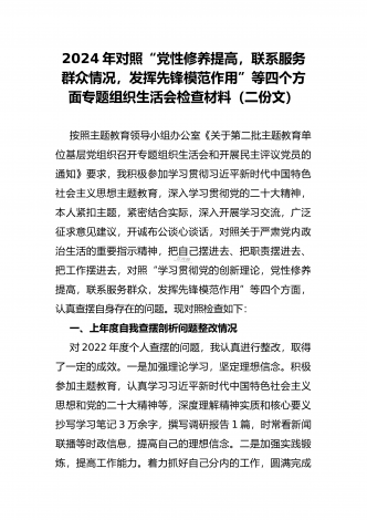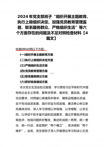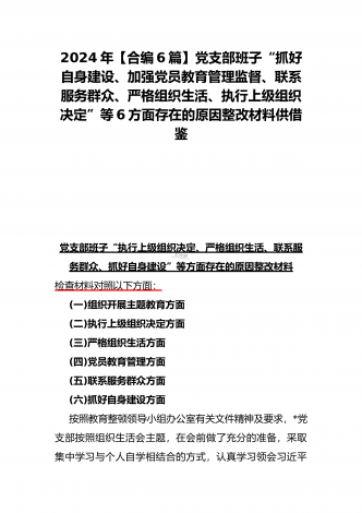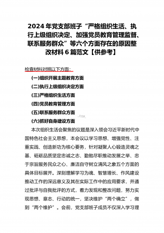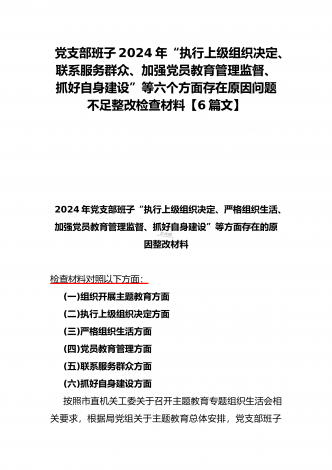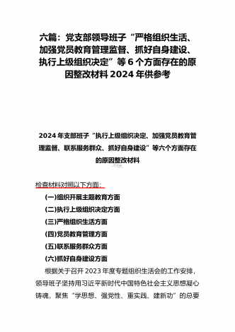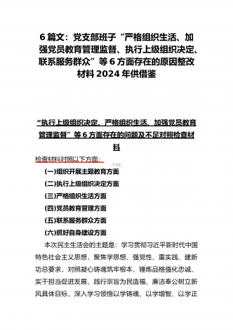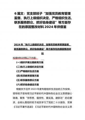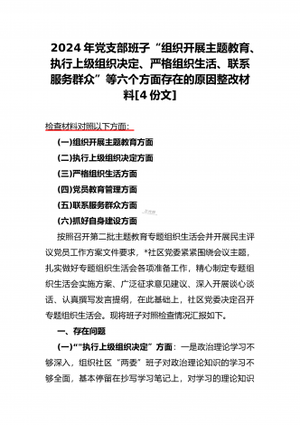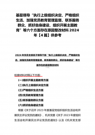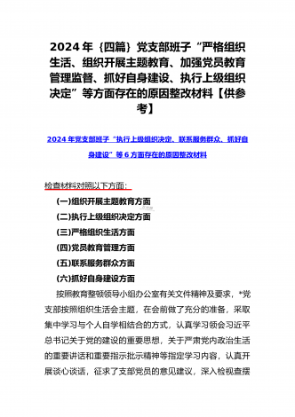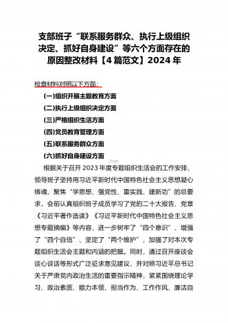 基层领导“执行上级组织决定、严格组织生活、加强党员教育管理监督、联系服务群众、抓好自身建设、组织开展主题教育”等六个方面存在原因整改材料2024年【4篇】供参考