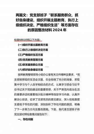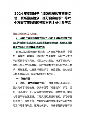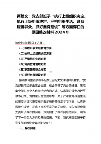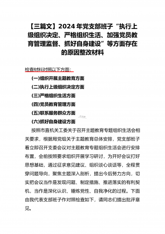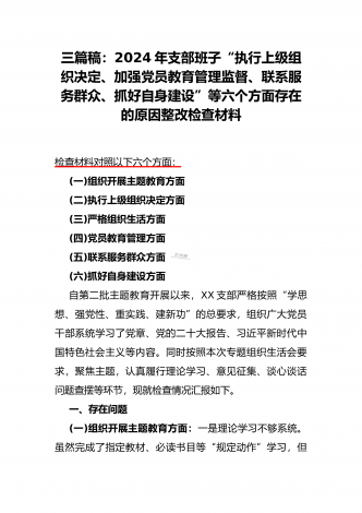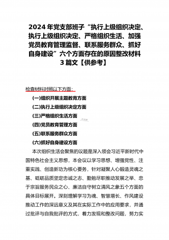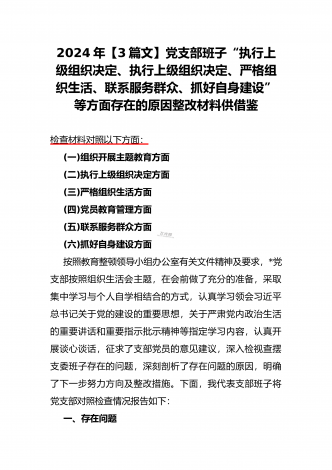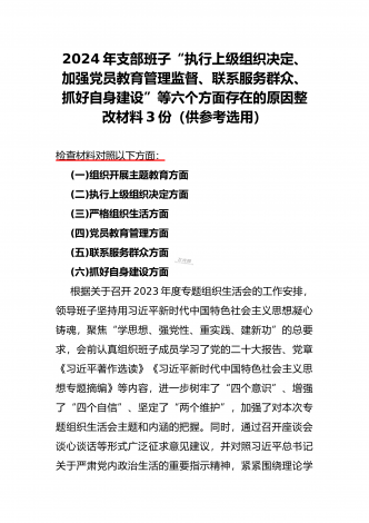 2024年党支部班子“执行上级组织决定、执行上级组织决定、严格组织生活、加强党员教育管理监督、联系服务群众、抓好自身建设”六个方面存在的原因整改材料3篇文【供参考】